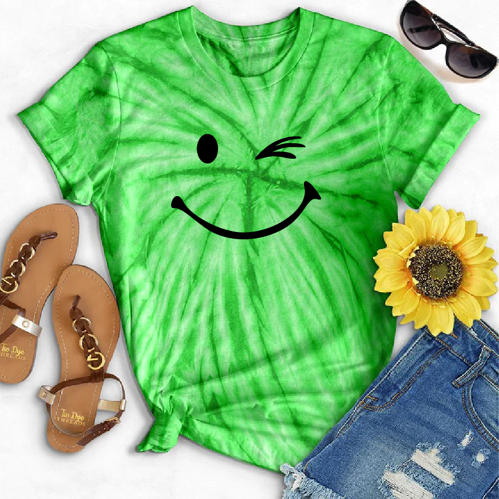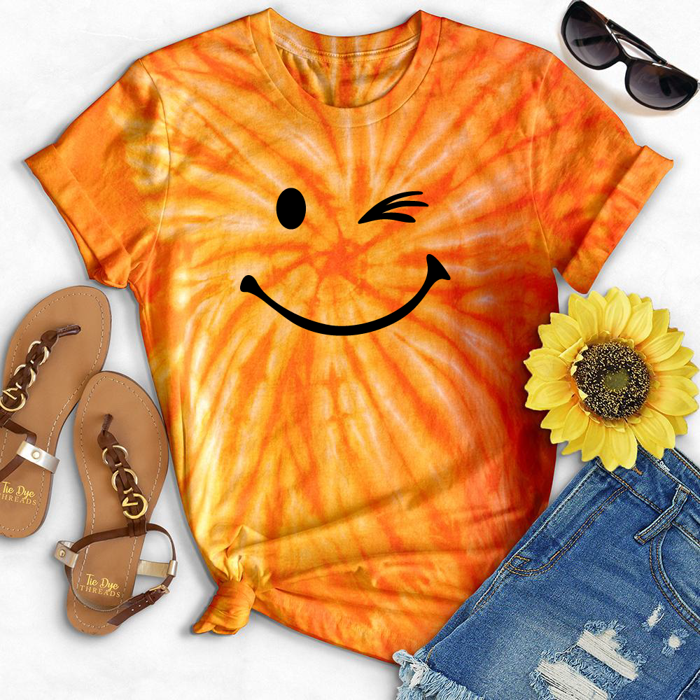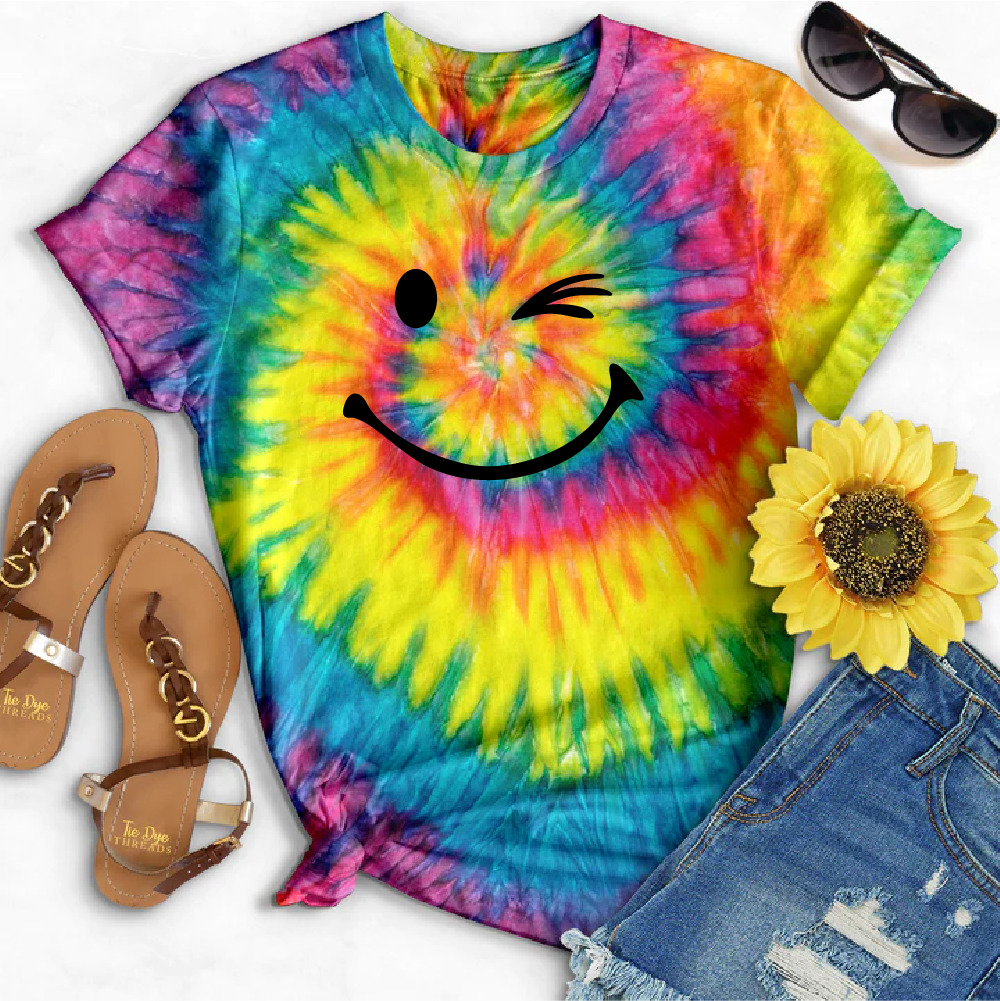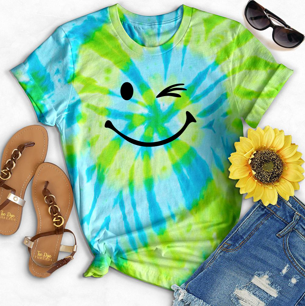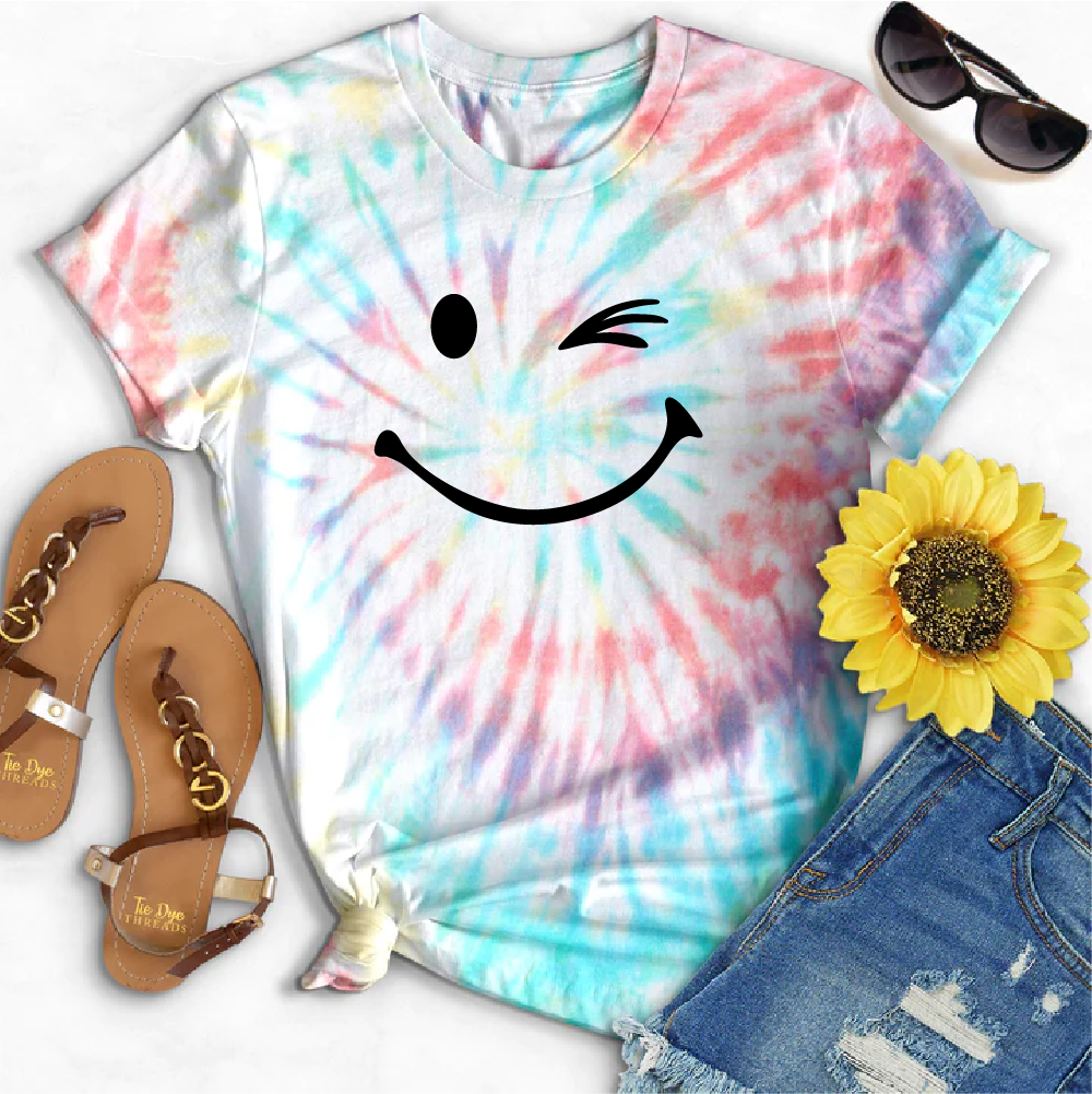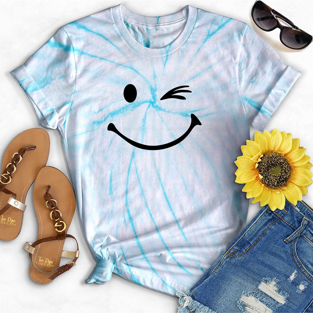 Bring back the '90s with this funkadelic Tie Dye Winking Tee! Show your fun, quirky side with this groovy piece featuring a winking face. Get ready to turn heads and make a statement! (wink wink)